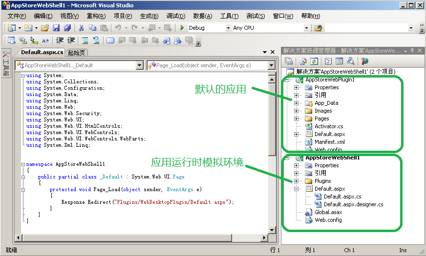 这边的“ASP.NET Web主应用程序”相当于AppStoreRuntime的模拟开发环境,接下来我们可以新建一个主程序,然后利用“ASP.NET Web插件”模板创建一个应用。默认的应用结构如下。