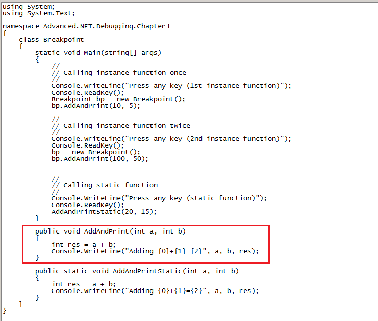 《Advanced .NET Debugging》 读书笔记 Listing 3-4/3-5: 为breakpoint.exe程序的AddAndPrint方法加