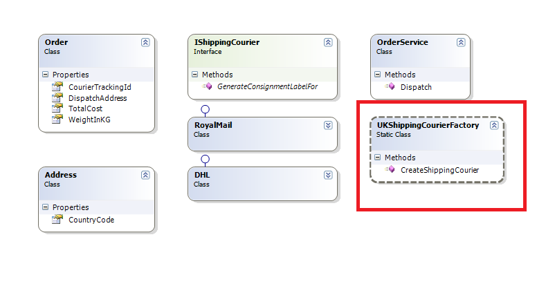 这里UKShippingCourierFactory这个类就是工厂,工厂的静态方法CreateShippingCourier传入Order类的实例,返回的是实现了IShippingCourier的对象(RoyalMail或者DHL的对象)。这样OrderService的Dispatch方法,就可以根据向CreateShippingCourier方法传入Order对象,返回IShippingCourier的实例,调用IShippingCourier的GenerateConsignmentLabelFor方法(注意IShippingCourier可能是RoyalMail的对象,也可能是DHL的对象),为Order对象取得CourierTrackingId值。