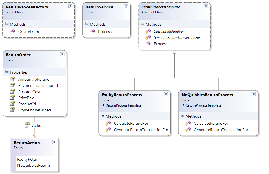 书中所举例子实现的功能是:ReturnOrder要根据FaultyReturn和NoQuibblesReturn这两种退货方式的不同,来计算AmountToRefund的不同。