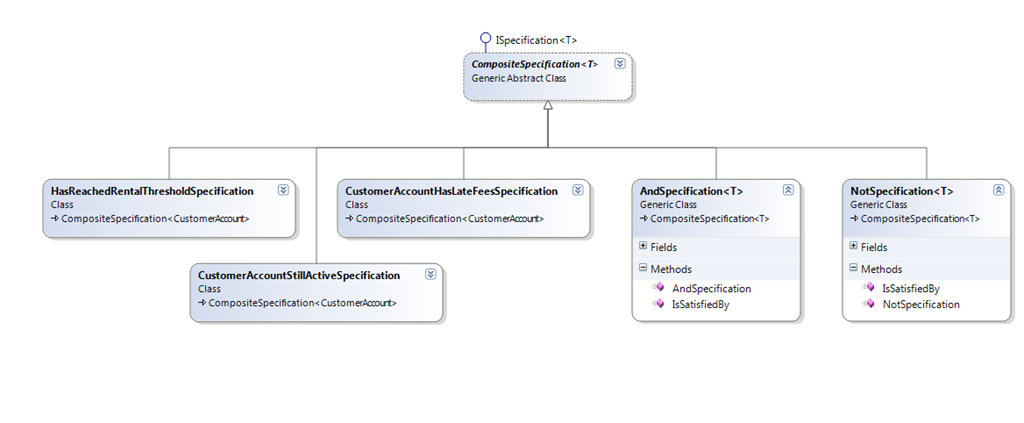 ISpecification<CustomerAccount> canRent = _customerAccountIsActive.And(_hasReachedRentalThreshold.Not()).And(_customerAccountHasLateFees.Not());