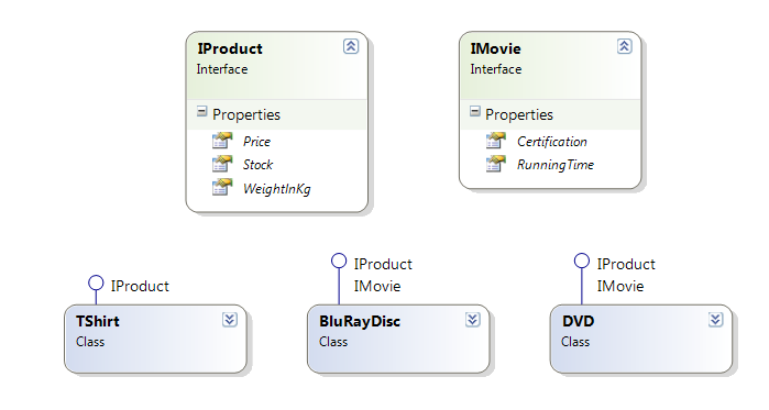 上图是实现了接口分离的一个UML。可见,Certification分级和RunningTime上映时间这两个属性只是DVD和BD才有的,TShirt并没有,所以如果不进行接口分离,那么TShirt也会具有这两个属性,这显然是不适宜的。