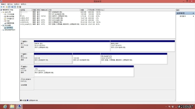 直接看到系统中的磁碟管理的系统配置,系统是安装在64G的M-SATA中,而资料碟被设定在120G的SSD上