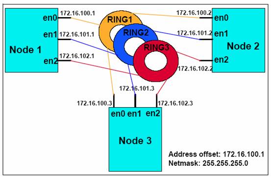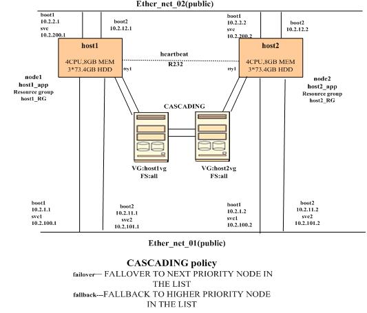 适配器名 功能 网络名 网络类型 属性 节点名 IP 地址 host1_tty0 heartbeat host1_net_rs232 rs232 serial host1 host1_l2_boot1 boot1 host2_net_ether_2 ether public host1 10.2.2.1 host1_l1_boot1 boot1 host2_net_ether_1 ether public host1 10.2.1.1 host1_l2_svc Service host1_net_ether_2 ether public host1 10.2.200.1 host1_l1_svc1 Service host1_net_ether_1 ether public host1 10.2.100.1 host1_l1_svc2 Service host1_net_ether_1 ether public host1 10.2.101.1 host1_l2_boot2 boot2 host1_net_ether_2 ether public host1 10.2.12.1 host1_l1_boot2 boot2 host1_net_ether_1 ether public host1 10.2.11.1 host2_tty0 heartbeat host2_net_rs232 rs232 serial host2 host2_l2_boot1 boot1 host2_net_ether_2 ether public host2 10.2.2.2 host2_l1_boot1 boot1 host2_net_ether_1 ether public host2 10.2.1.2 host2_l2_svc service host2_net_ether_2 ether public host2 10.2.200.2 host2_l1_svc1 service host2_net_ether_1 ether public host2 10.2.100.2 host2_l1_svc2 service host2_net_ether_1 ether public host2 10.2.101.2 host2_l2_boot2 boot2 host2_net_ether_2 ether public host2 10.2.12.2 host2_l1_boot2 boot2 host2_net_ether_1 ether public host2 10.2.11.2