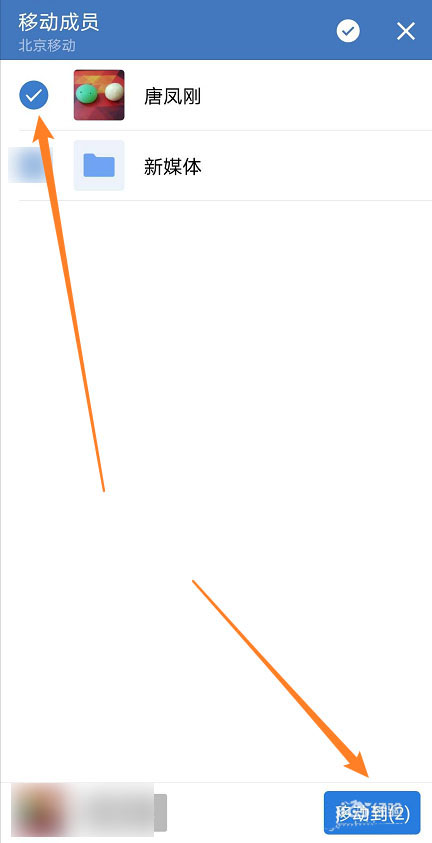6、选择移动成员,点击【移动到】,选择【部门】,点击【确定】即可。