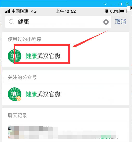 2、点击搜索框,输入健康武汉官微,找到小程序,如下图: