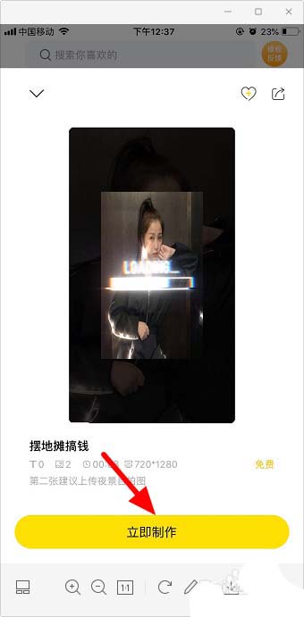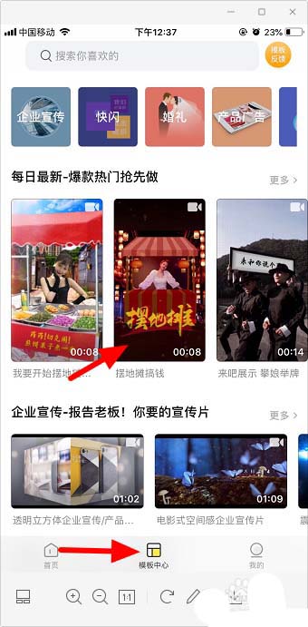 进入传影记,进入模板中心,然后从中选择摆地摊搞钱模板。