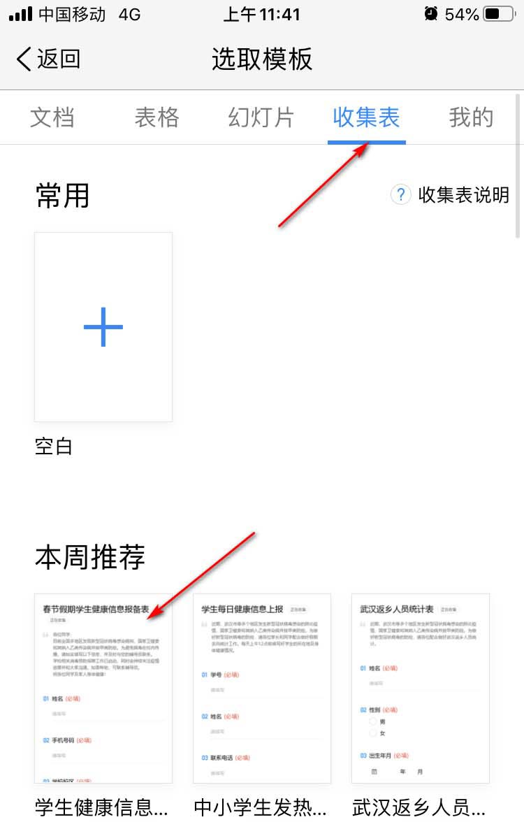 5、在【收集表】栏里,找到本周推荐的,点击里面的【学生健康信息报备表】模板。