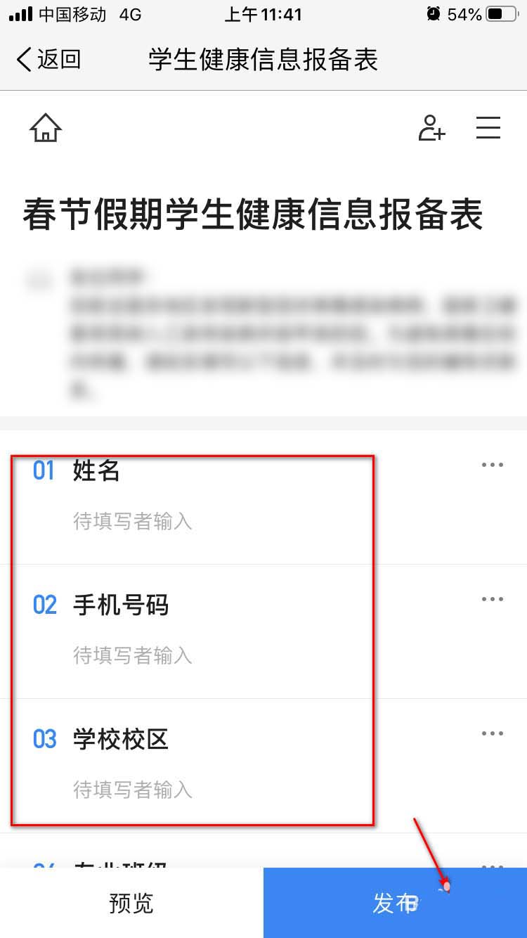6、可以自己对姓名、手机号码、学校校区等进行自定义修改,最后点击【发布】按钮即可发布,发送给学生即可开始登记。