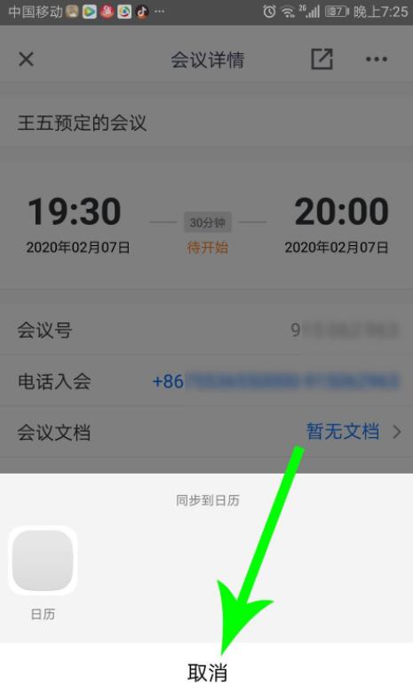4、打开会议详情界面点击取消,然后检查会议设置,检查无误后将会议号和开会时间告知参会者,然后点击×关闭界面。