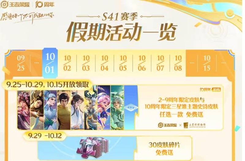 2-9周年限定皮肤与10周年限定三星堆主题史诗皮肤任选一款免费送:活动火热进行中,玩家可以在9月25日至10月29日,以及10月15日开放领取期间,任选一款心仪的皮肤免费带回家。特别提醒,10周年限定史诗皮肤在活动结束后将上架商城限时售卖,想要免费获取的玩家千万不要错过!