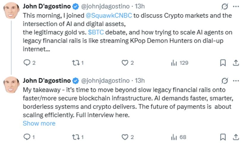 Coinbase机构策略主管约翰·达戈斯蒂诺在2025年9月30日接受CNBC采访时阐述了这一愿景。他认为,在当今快节奏的数字世界中,要求AI代理与百年历史的金融体系协作是荒谬的。