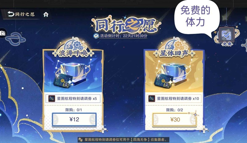 ⑤同行之愿:右上角免费体力