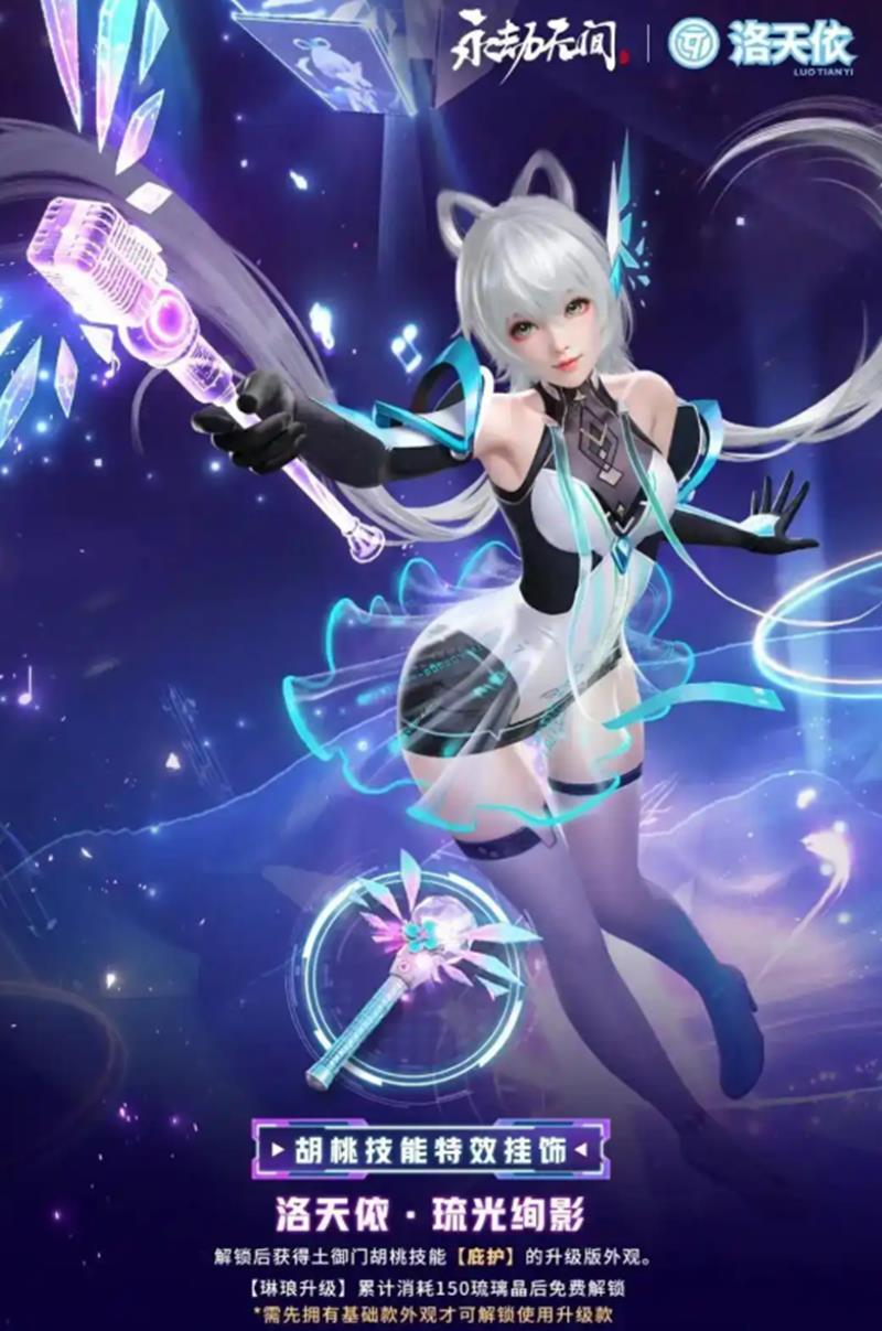 永劫无间手游这次与洛天依的联动主要集中在胡桃这位英雄身上。胡桃获得了一套以蓝白色为主调的联动时装,整体设计充满了虚拟歌姬的科技感。