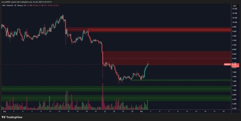 分析师CW在X平台分享的图表中,将9.6美元标注为UNI下一个关键"卖盘墙"。图中红色区域显示该价位存在大量卖单堆积和历史抛压点。