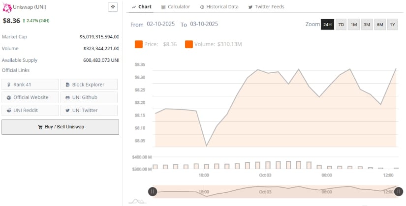 截至撰稿,UNI报价8.23美元,24小时跌幅1.54%。该代币在去中心化金融(DeFi)头部资产中保持强势地位,活跃的交易量与广泛的市场参与度印证着持续的资金关注。