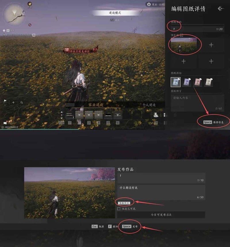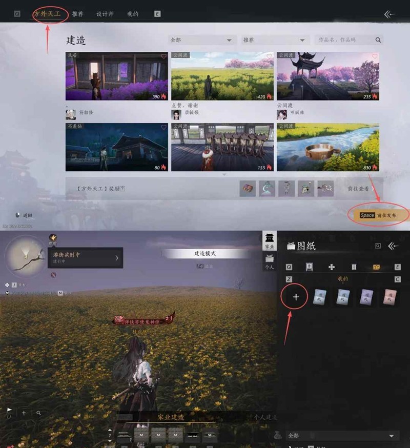 云间渡打开建造模式→设计图→方外天工→前往发布→点+号创建保存图纸(名称和图片随便填)→上传万象集(勾选标签发布)