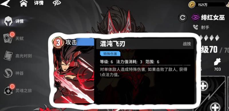 作为主要的单体攻击技能,混沌飞刃专精于对单一敌人造成高额特殊伤害。该技能不仅具备出色的斩杀能力,还能在击败目标后返还一定法力值,有效缓解技能循环压力。这一续航机制让她在连续作战中保持稳定的输出节奏,不会因蓝量不足而中断攻势。对于需要快速清点或集火高威胁目标的战斗场景,混沌飞刃展现出极高的战术价值。