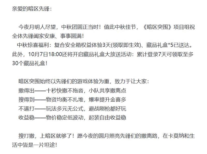 暗区突围中秋惊喜福利现在开始发送,从明日开始游戏还将开启藏品礼盒活动~下面我们来一起看看吧~