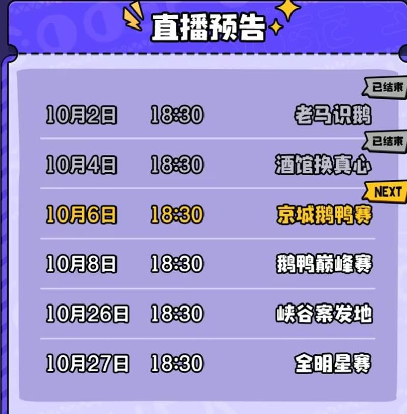 观看方式:各直播平台【鹅鸭杀手游】&【鹅鸭杀赛事】&车队主播账号同步开播