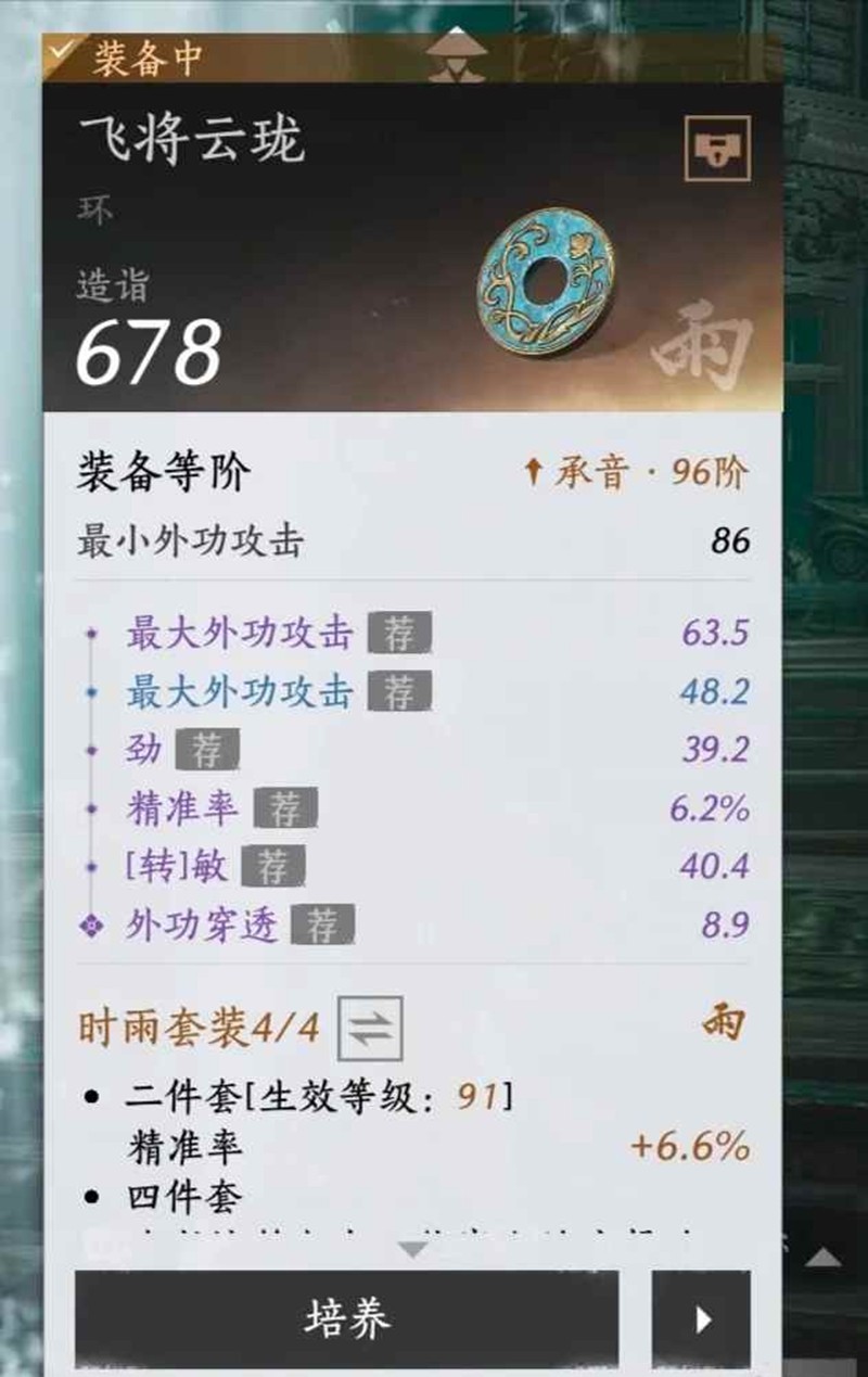 可能讲数值不是那么直观影响判断承音为什么好于普通装那么举两个实例:看这个环从91变成了96的承音培养完毕最终他的数值为73 73 45 7.5 45。