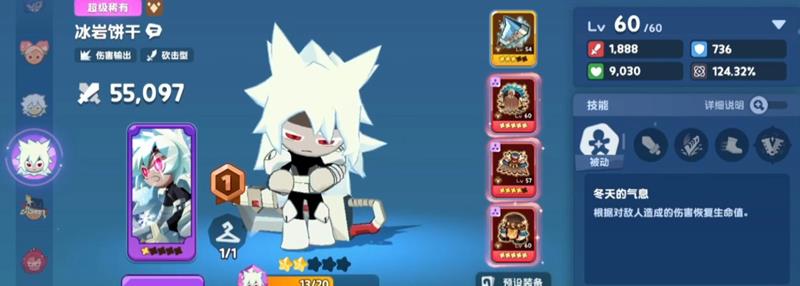 冰岩饼干定位为高爆发的土属性输出角色,基础属性在60级时可达到1888攻击力和124.32%的属性加成,输出面板非常优秀。然而其防御仅有736,生命值为9030,生存能力偏弱,在战斗中容易暴毙。这种以血换伤的设计使得他在高难度关卡中风险较高,必须依赖治疗或护盾类角色进行保护,否则持续作战能力会大打折扣。因此在饼干人联盟的阵容构建中,围绕冰岩饼干搭配续航角色是关键。