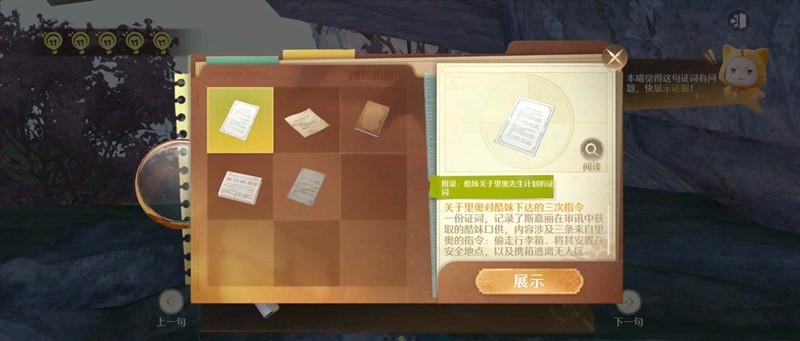 .图对质选项第一条对话,展示证据选【李奥的手记】,图选择第三条对话,展示证据选【酷妹与里奥先生的证词】