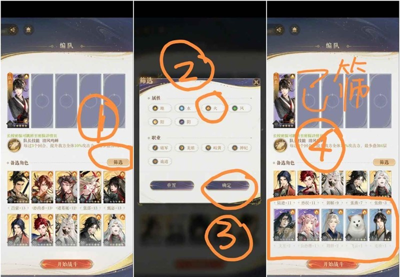 也可以是安期带火+风,♢操作:上了黄金剑后,火攻击叠【火】,但是风攻击又叠了【风】,敌方普攻后会叠【冰】,冰会和火消融。如果你不放心,可以是安期+火+风+水的组合。