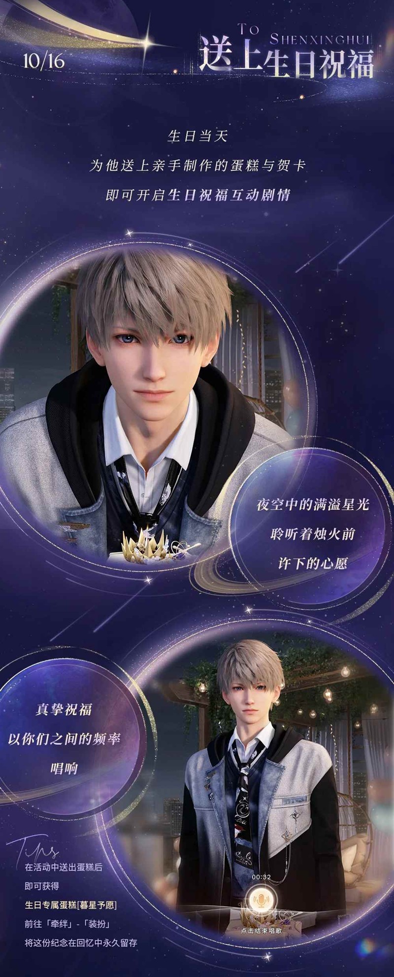 为沈星回筹备生日庆祝,生日限定思念、日常服装、拍照动作、「深空许愿券·限时*20」等缤纷奖励等你获取!