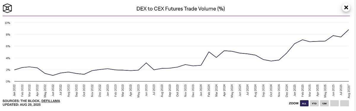 一方面,过去几年间 Perp DEX 正不断蚕食着中心化衍生品交易所(Perp DEX)的市场份额,The Block 数据显示,DEX 之上的合约交易量与 CEX 之上的合约交易量比值在过去几年间始终保持着增长态势,在刚刚过去的八月更是创下了 8.8% 的历史峰值。