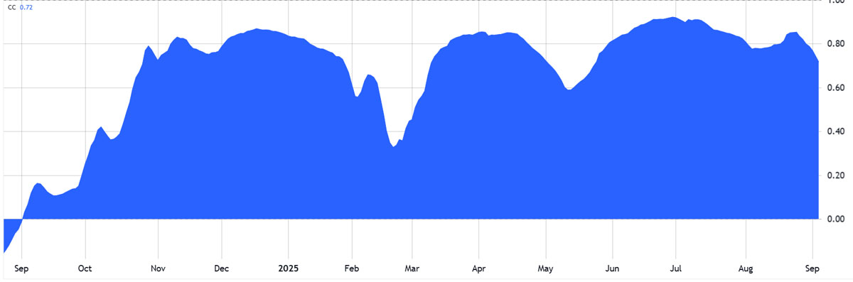 融资成本降低带来的通胀压力,最终可能削弱经济增长,尤其是在高关税背景下。因此,虽然降息可能带来短期利好,但黄金和短期国债的强劲需求凸显了持续的风险厌恶,这可能对加密货币造成压力。纳斯达克指数与比特币(BTC)的60天相关性高达72%,显示两者走势高度一致。