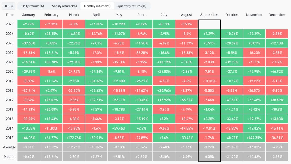 根据Coinglass历史数据,比特币在9月份的平均下跌幅度为3.77%,是全年仅有的两个平均回报率为负的月份之一。