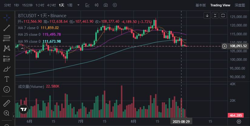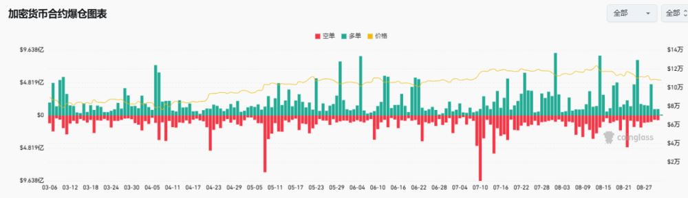 市场在8月末已经显示出疲软迹象。8月26日,比特币跌至108,717美元,连续第4日下跌。以太坊也大幅回调,跌至4,314美元,较历史高点大跌13%。在之后的8月29日,比特币在短暂反弹后再次大幅下跌至最低107300美金,这几次不断的下跌引发了大规模清算。
