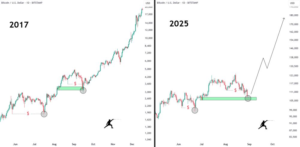 2017 年和 2025 年的图表叠加呈现出近乎镜像的景象。在这两个周期中,比特币都在 8 月底大幅下跌,在关键支撑位站稳脚跟,随后反转走高。