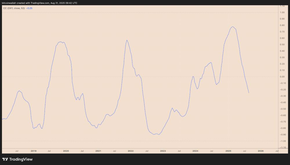 BTC/USD 与 DXY 52 周相关系数。