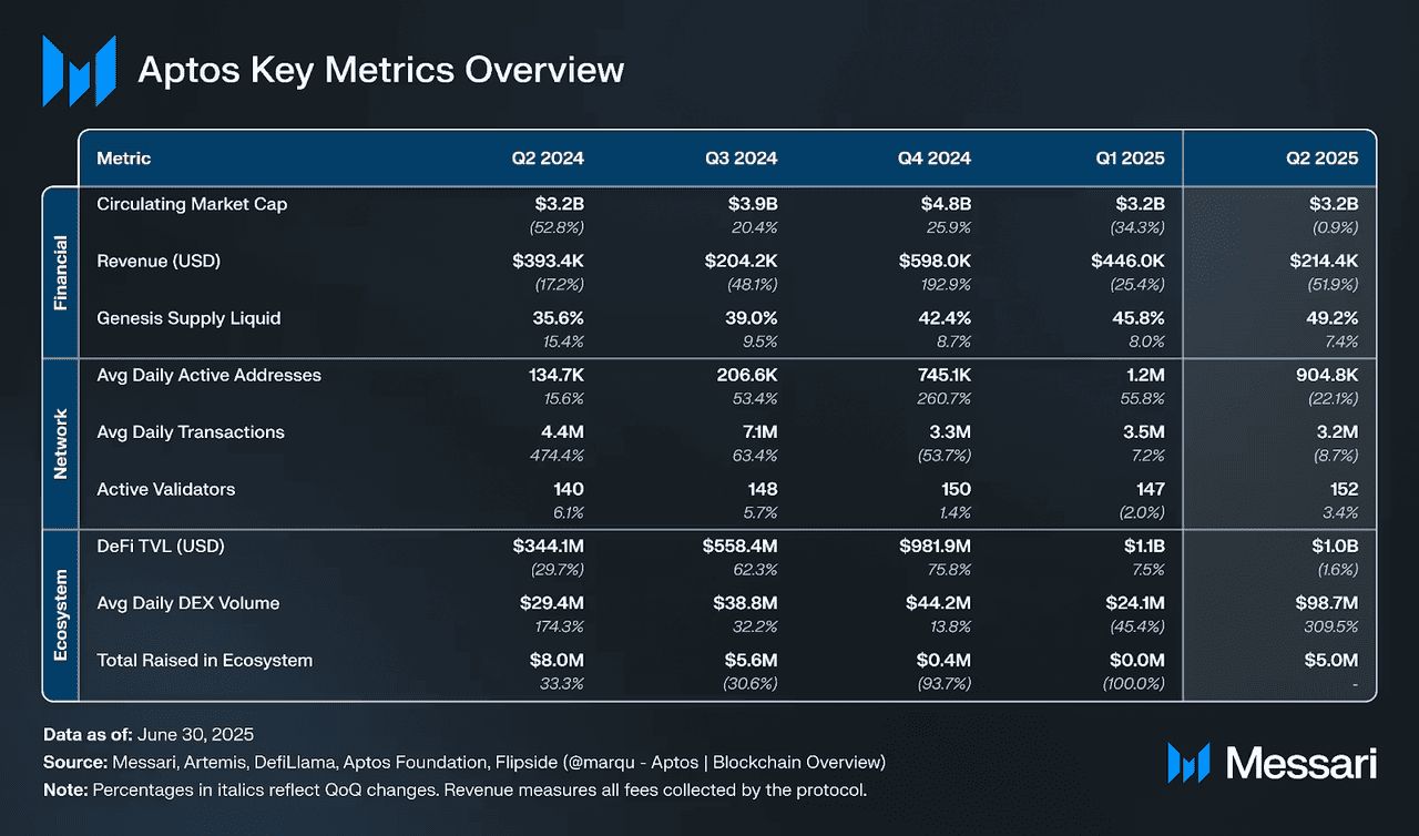通过结合性能、资产可编程性和机构流动性,Aptos 已成为成长最快的 Layer-1 区块链之一。2025 年第二季度,其平均费用仅为 0.00011 APT,约 0.00052 美元,在 Baby Raptr 升级后,最终确认延迟减少了 100-150 毫秒,为订单簿、永续合约和即时应用进程带来了类似 Web2 的用户体验。这种效率助推第二季度 DEX 交易量超过 90 亿美元,其中 Hyperion 和 ThalaSwap V2 占据了大部分交易活动。