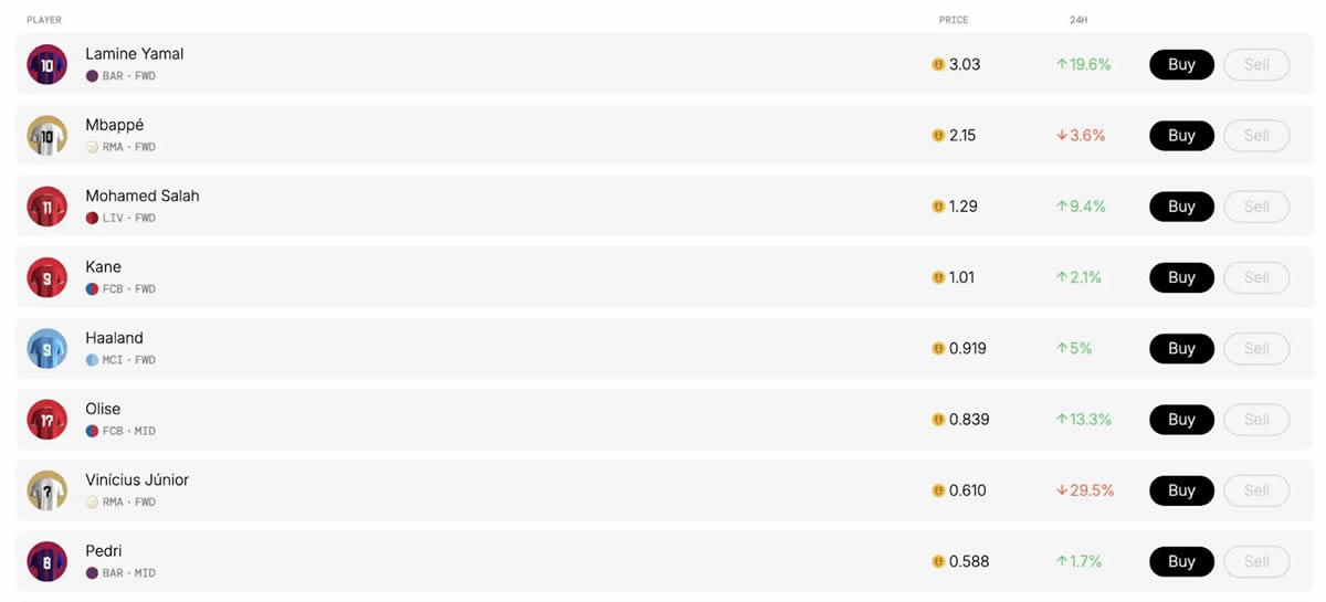 拉明·亚马尔——4490万美元基利安·姆巴佩——3220万美元哈里·凯恩——2020万美元但拥有球星并非唯一的盈利方式。早期用户注意到,名气较小的球员能带来更好的回报,因为回报既取决于球员的表现,也取决于有多少人愿意花钱购买。亚马尔的进球回报可能比被低估的中场球员的助攻更低,原因很简单,分享回报的人更少。