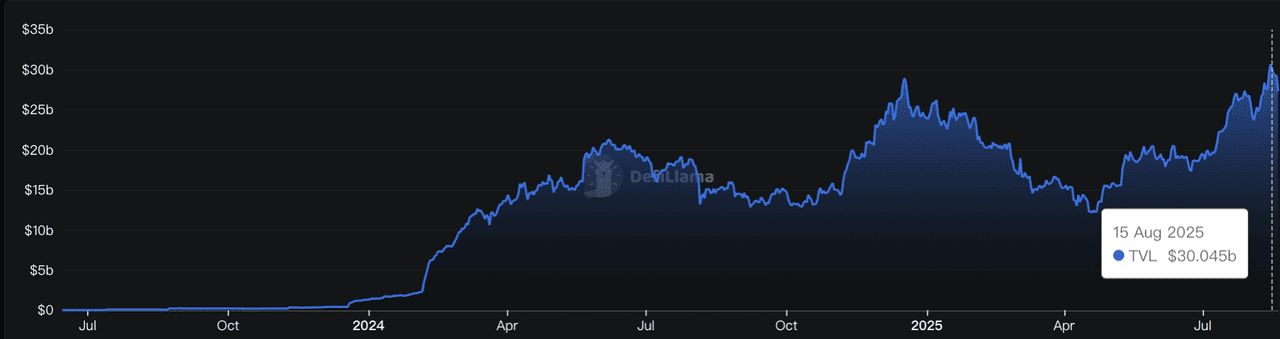 流动性再质押TVL 在2025 年8 月达到300 亿美元| 来源:DefiLlama