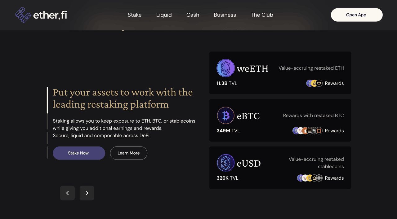 Ether.fi 透过其针对以太坊的eETH 和weETH代币开创了原生再质押,并扩展到比特币,推出eBTC,现在更提供稳定币再质押功能以优化收益。该协议可让使用者自动赚取ETH 质押和再质押奖励,无需额外操作或锁定期间,而eBTC 则透过比特币质押(透过Babylon)和再质押(透过EigenLayer、Symbiotic 和Karak)提供双重收益。凭借对LBTC 和WBTC 存款的支援、稳定币金库以及与400 多个DeFi 协议的整合,Ether.fi 已将自己定位为一个全面的多资产金融平台。