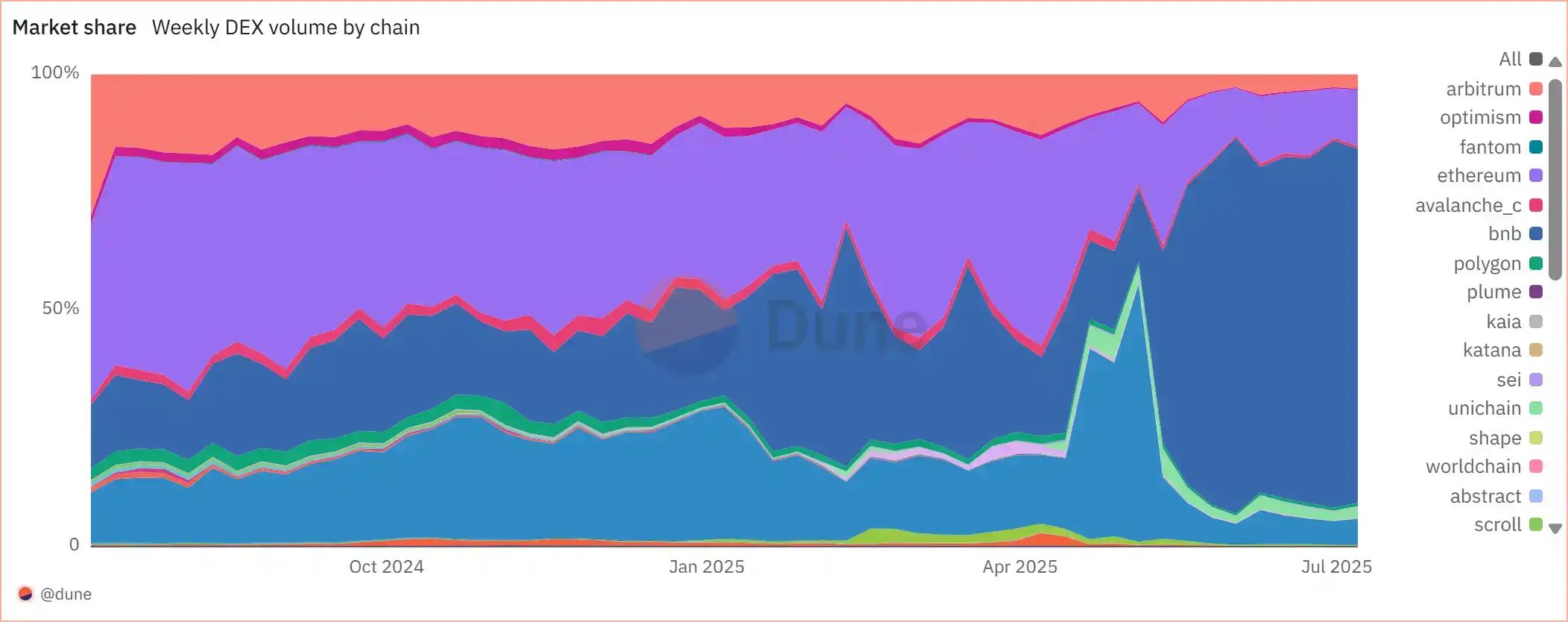 各公链在周度DEX 交易量中所占份额的演变,其中深蓝色区域代表BNB Chain,数据来源:Dune