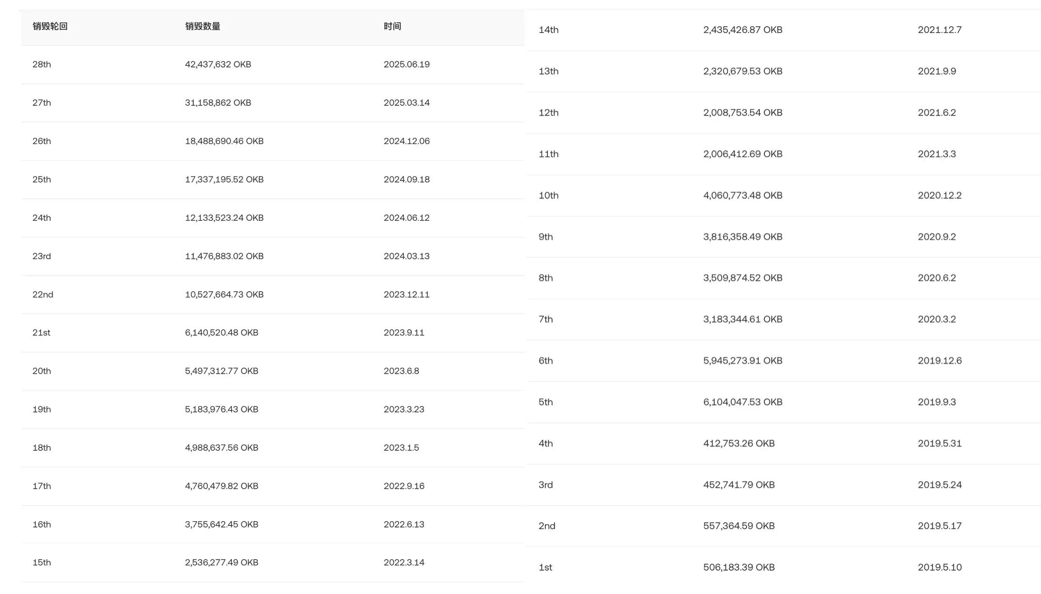 2025 年,是OKB 涨幅最猛的一年,尤其是在宣布「巨额销毁OKB」的那一天。这是OKB 历史上的第29 次销毁,也是最后一次销毁。手笔之大,币圈罕见。