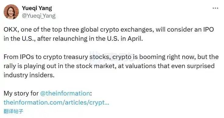 川普上任后打开了加密产业的IPO 缺口,OKX 考虑赴美IPO 是一件「既是意料之外,又是意料之中」的事。 6 月23 日,据The Information 加密记者Yueqi Yang 披露,加密货币交易平台OKX 在今年4 月重返美国市场后,正考虑在美国进行首次公开募股(IPO)。
