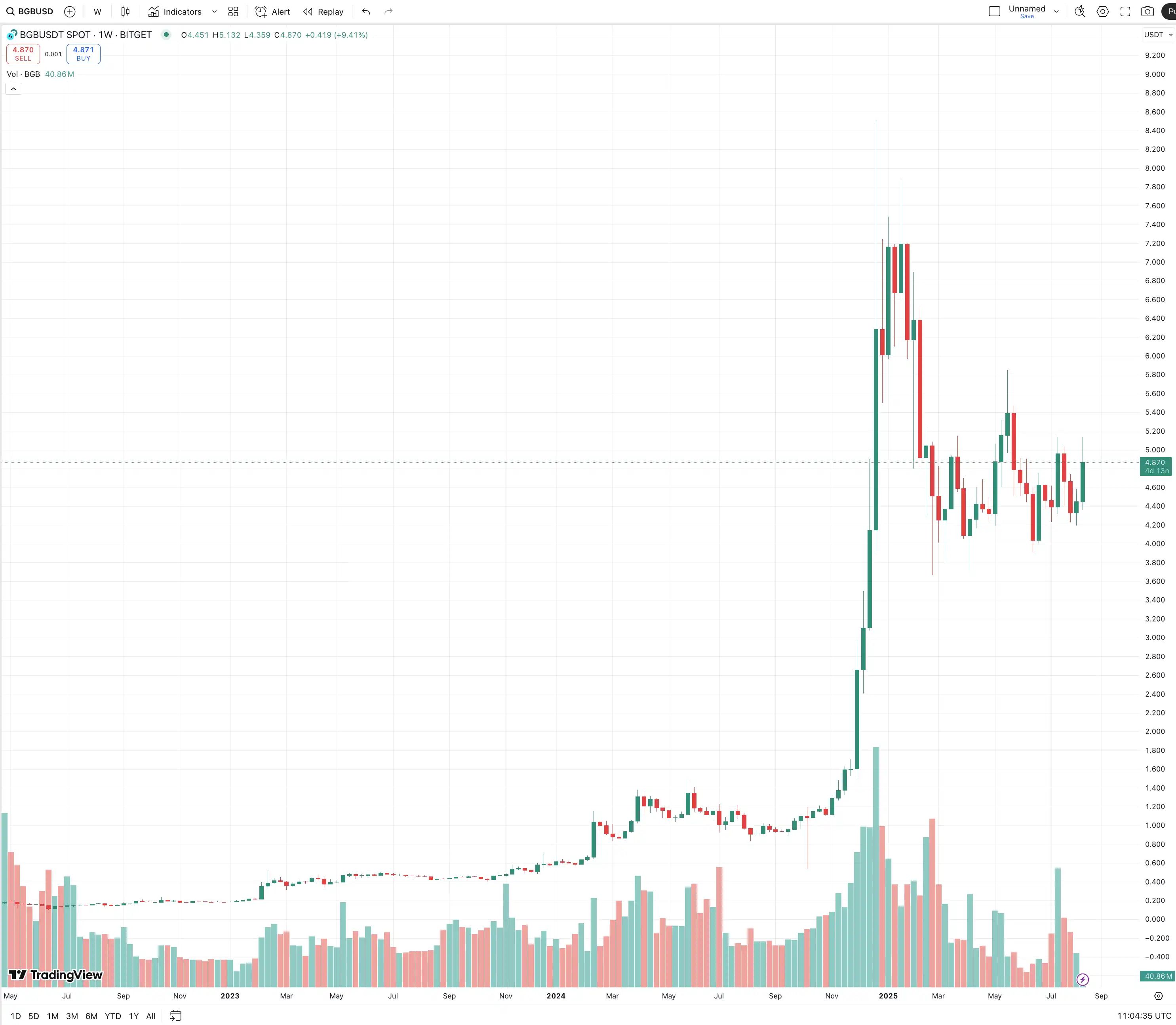从2023 年初的0.20 美元,到2025 年站上5 美元,BGB 在两年内走出了一条几乎25 倍的曲线。