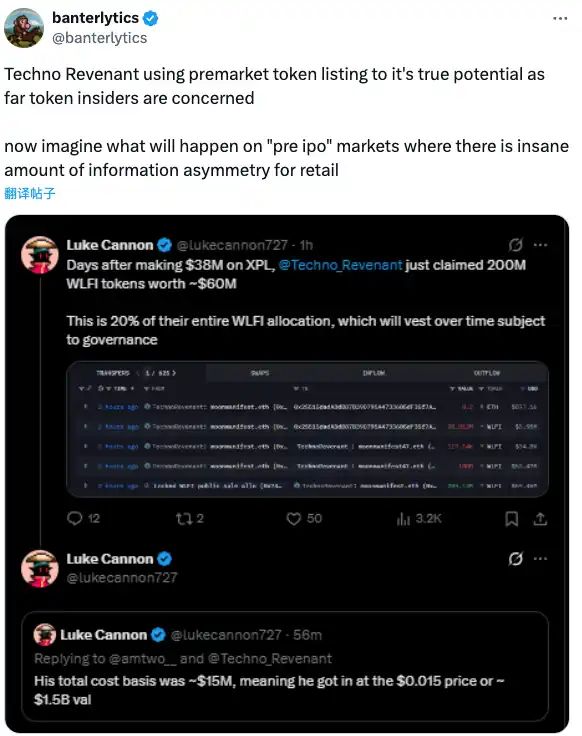 这也进一步引发了社区对近期火热的链上股权(Pre IPO)模式的担忧。KOLbanterlytics在 X 上表示,「看到了 TechnoRevenant 在代币的 Premarket 上已经产生了如此大的影响,想象如果发生在拥有更多内幕的 Pre IPO 上会如何」