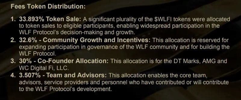 根据 WLFI 的「金皮书」,WLFI 代币将赋予持有者对影响协议的重要事项(例如升级)的投票权。在预期的代币分配中,33.893% 透过代币销售,32.6% 用于激励和社区发展,30% 用于「初始支持者」分配,「核心团队和顾问」占 3.5%。