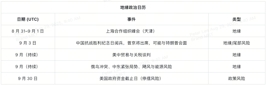 – 美国政府停摆风险:9 月 30 日资金截止日期– 关税谈判:美欧、美中关税争端或再起– 能源与冲突:俄乌局势、中东风险、飓风季能源冲击总的来看,9 月将成为央行、加密与地缘风险的交汇点。降息预期、ETF 资金流、解锁潮与政治风暴交织,这个月或许就会决定 2025 下半年至 2026 年初的市场走向。