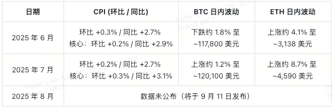 – 非农就业(9 月 5 日):就业数据疲软会强化降息预期,但如果就业强劲,市场判断可能出现分歧。– CPI(9 月 11 日):虽然核心通胀在下降,但基数效应可能带来意外反弹。历史上 CPI 发布日,BTC经常出现 2–5% 的日内波动,ETH的反应甚至更大。交易员不仅要看头条数据,还要留意修正值、中位数和市场“耳语预期”。