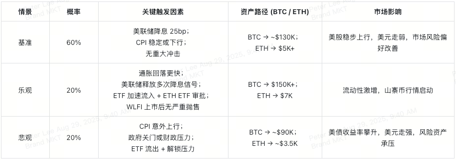 – 宏观大事件定调 2025年9月币圈日历:非农就业(9月5日)、美国CPI(9月11日)、美联储利率决议(9月17日)是决定市场预期的核心锚点,鲍威尔讲话与降息预期直接影响美元、股市与加密资产。– 地缘与政策风险不容忽视:美国政府停摆最后期限、关税博弈与能源冲击,可能随时打乱市场节奏,成为9月隐藏的扰动因子。– 加密市场专属催化剂来袭:比特币ETF持续吸引资金流入,以太坊ETF审批预期升温,WLFI在9月1日完成超22亿美元代币发行,加上超过10亿美元的代币解锁,令2025年9月币圈日历充满波动看点。– 多重情景路径演绎:基准情景偏向软着陆(BTC约13万美元、ETH超5000美元),但若降息加速或WLFI引爆流动性,可能迎来牛市行情;若通胀反扑或政策受挫,则风险资产可能全面承压。– 资金面与仓位乐观却脆弱:ETF流入、合约未平仓量增加、看涨期权集中与稳定币供应创纪录,都让2025年9月币圈具备战术性机会,但市场对降息预期与WLFI需求的变化同样可能引发反转。9 月的一切波动,都绕不开鲍威尔。
