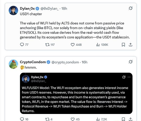 WLFI颠覆了这一模式。USD1储备金所产生的利息通过智能合约自动用于在公开市场回购并销毁WLFI。