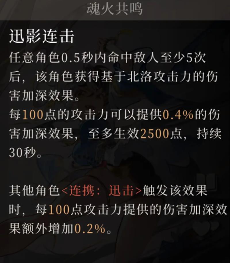 柯尔特与北洛共同上场时,可触发魂火共鸣效果“迅影连击”。只要任意角色在0.5秒内击中敌人5次以上,即可激活该效果,基于北洛的攻击力提供额外伤害加深。每100点攻击力可提升0.4%伤害,最多叠加至2500点攻击力,持续30秒。若其他角色触发连携迅击,则额外增加0.2%的伤害加深效果。这一机制使得北洛与柯尔特之间的配合至关重要,柯尔特不仅自身具备枪械类连续攻击能力,还能通过标签技能单向辅助北洛,强化主C输出。